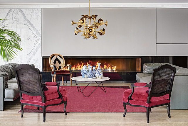 Este apartamento cuenta el mobiliario de la firma Brabbu para llenar las estancias de orden y espectacularidad. Esta firma tiene colecciones de mobiliarios que merece la pena admirarlos por sus diseños eclécticos y con mucha personalidad. La sala de estar consta de paredes en distintas tonalidades de grises que contrastan con el papel pintado a mano de la firma De Gournay Pink Flamingos. En el comedor se aprecian los espacios abiertos, concepto muy actualizado en interiores por generar amplitud y ser un lugar cómodo para las reuniones que les gusta organizar a sus dueños. El color amarillo brillante de la cocina conjunta a la perfección con las lámparas negras junto con una iluminación dorada y puntual de la pared, todas ellas de la firma Delightfull.