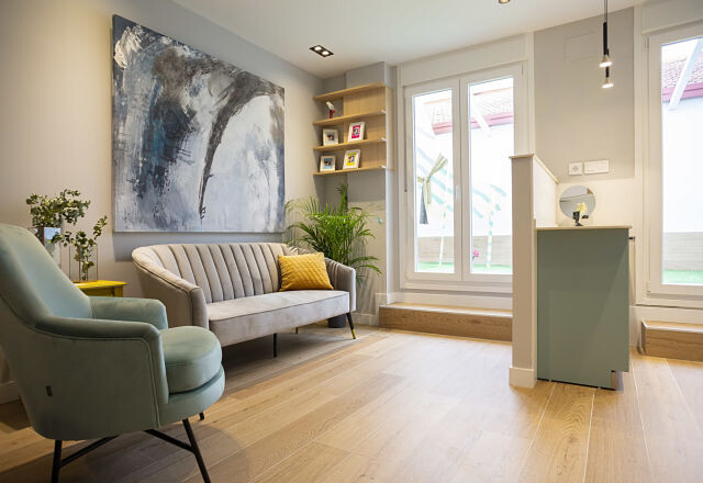 El proyecto de interiorismo planteado ha consistido en una redistribución de la vivienda, en la que los ambientes principales se conectan y se abren a la terraza exterior a modo de jardín exterior.