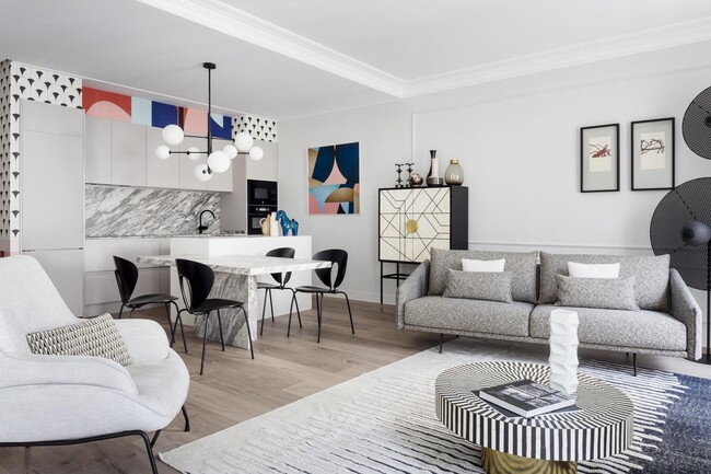 En la parte superior de los muebles de cocina unos papeles pintados de diseño art decó en blanco y negro enmarcan la cocina a los lados, y en el centro se ha colocado un papel con distintos colores (azules, naranjas) cuyo motivo se repite en un pared de la cocina en forma de cuadro creando un efecto de "cocina joya" cuyo diseño atrae todas la miradas.