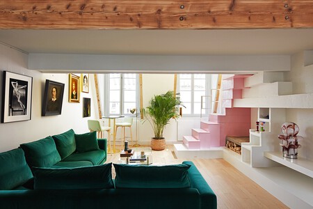 El rosa para la escalera se inspiró en el suelo de resina original del apartamento, un color con el que los propietarios estaban particularmente apegados, y el verde que se distribuye en numerosos detalles por el apartamento es una referencia directa a las plantas y la naturaleza.