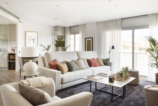 El salón ha ganado metros al prescindir del recibidor. Ahora la entrada te dirige a esta estancia más grande y luminosa que se conecta también con la terraza, la cocina y el resto de la casa. Esta conexión fomentan la interacción visual y hace la convivencia mas agradable.