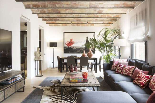 El trabajo de los interioristas incluía además de la reforma su interiorismo y la decoración. Un trabajo integral en cuyo resultado influyó significativamente la recuperación de dos elementos estructurales de origen de la vivienda; el techo con las bóvedas de volta catalana y las paredes de ladrillo visto del salón y la suite. Ambos dan idea de la antigüedad de la vivienda y fueron una grata sorpresa, dado que estaban ocultos y surgieron con el trabajo de las obras. Los propietarios quisieron mantenerlos, ya no solo por la altura que se ganaba, sino también por la personalidad que aporta a la estancia. De esta manera el resultado fue una "un piso singular, con mucho carácter y un toque industrial".