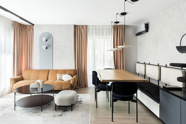 Este apartamento situado en el centro de Bucarest juega con los conceptos masculino y femenino y da como resultado un piso de diseño vanguardista y equilibrado. La parte femenina esta representada por las líneas curvas y la masculina con el uso del negro en forma de muebles y líneas que enmarcan paredes y techos. Además de este binomio, este casa familiar destaca por su abundante luz natural.