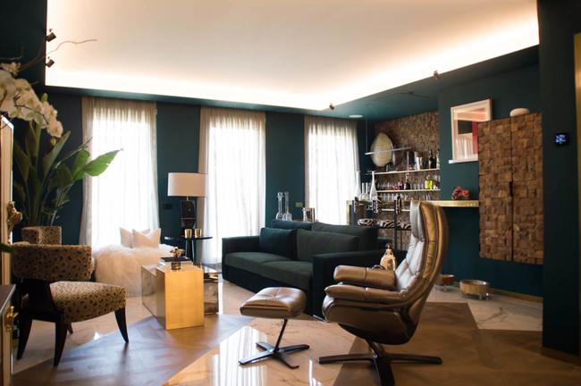 El salón sin TV. Este enorme living con sofás a medida en terciopelo verde botella, enormes puff y la maravillosa butaca Revive de Natuzzi en piel dorada (podéis verlo en la imagen de portada), se configura para disfrutar con los amigos del arte, y de las copas.
