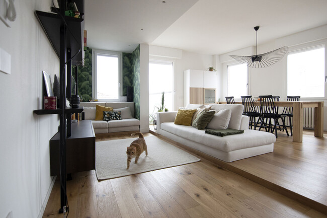 En cuatro a los materiales y colores, tanto en el salón como en el resto de la casa se han usado materiales neutros y atemporales como una tarima de acabado roble, carpinterías blancas y toques negros.