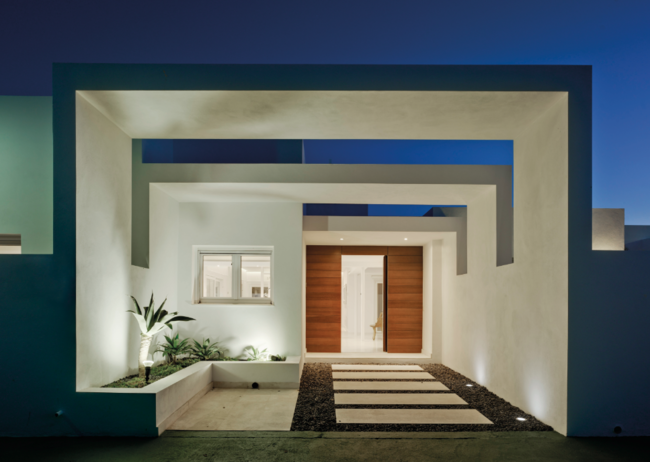 De la vivienda original se conserva parte de la estructura y la distribución en una sola planta, que se reorganiza para conseguir espacios más abiertos, luminosos, cómodos y funcionales. En la fachada exterior se elimina el enfoscado a la tirolesa típico de la zona, dotándola de un acabado más moderno, y se aplican exclusivamente carpinterías de aluminio blanco. La casa se rodea de jardines con palmeras, un huerto, dos terrazas, dos porches y una piscina además de otras estancias funcionales.