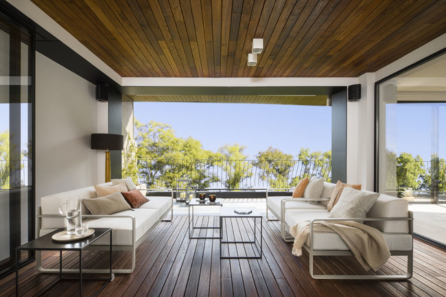 La pieza clave que hace especial la unión entre exterior e interior en esta vivienda es una chimenea exterior, integrada en un marco negro, que encuadra la terraza de fuera y la une visualmente con la sala de estar, fundiendo estos dos espacios a través de una puerta de la marca Vitrocsa que se abre completamente y deja un gran espacio común.