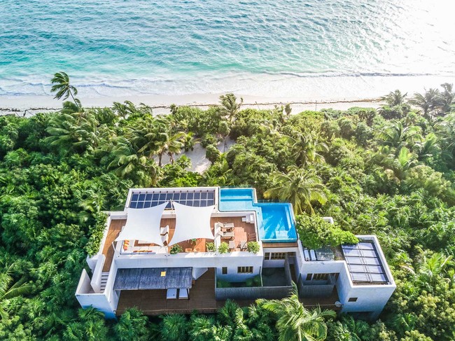 La vivienda incluye cuatro dormitorios con baño privado, sala, con comedor y cocina integrada, espacios de terrazas amplias con vistas al mar caribe y a la laguna, así como una alberca y jacuzzi. En el mobiliario combina materiales naturales con otras piezas fabricadas en sintético como las sillas tipo panton que podemos encontrar en Amazon por 34,88 euros.