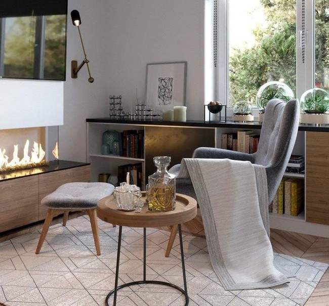 Los tonos claros, activos y el pavimento laminado combinado con el cerámico crean espacios adorables. La combinación perfecta de suelo con los azulejos hexagonales de Bayker Cerámica y los tonos naturales de madera dan calidez al apartamento. En la pequeña sala de estar se proyectó una biochemenea con paneles incombustibles (montada dentro de un pilar de yeso ignífugo), elemento con el que sus clientes habían soñado y, sobre ella una gran pantalla de televisión.