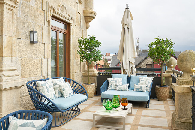 El proyecto ha sido muy especial pero ha venido cargado de las limitaciones establecidas por la protección patrimonial del Palacio Eguzkialde. A pesar de las cuáles, la interiorista consiguió implementar todas las peticiones solicitadas por los dueños en forma de muchos armarios, una iluminación técnica muy estudiada, estancias espaciosas y una estética elegante. Compartiendo con la propietaria el gusto por el color, también lo aplica, sobre todo, el azul , visible en el papel de la cocina y el pasillo, en el mobiliario de la terraza, en el armario del hall y en algunos detalles del salón.