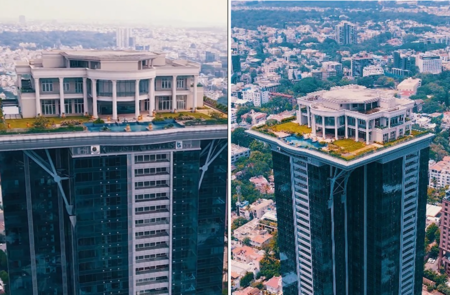 La mansión se encuentra en la azotea de un complejo de apartamentos de lujo de 33 pisos en la India