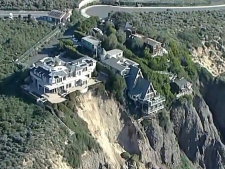 Estas mansiones están situadas en lo alto de un acantilado en primera línea de mar en una zona conocida como Dana Point. Y tras las intensas lluvias, lo que era el jardín trasero cedió precipitándose hacia el océano desde 45 metros de altura, dejando el acantilado justo al lado de las viviendas. Los restos del derrumbe se pueden ver en las imágenes al pie del acantilado.