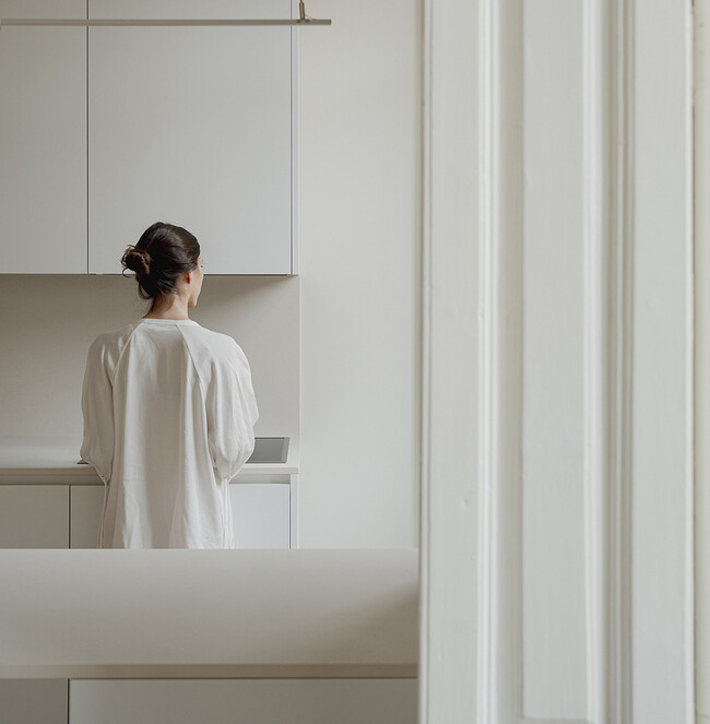 Aprovechando estas circunstancia en su interior, los apartamentos reflexionan sobre la funcionalidad actual y la ausencia de ornamento (al estilo Adolf Loos) mientras establecen un diálogo con los vibrantes detalles de este singular edificio.
