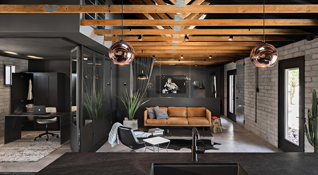Este loco proyecto de una casa todo de negro salió de la mente creativa de la diseñadora Amy Beaumont del despacho Knob Modern en Phoenix, Arizona en los Estados Unidos. La estructura original es una simple y típica casa de suburbio norteamericano del año 1964. Si la transformación exterior ha sido mínima y se ha enfocado principalmente en el color, el interior ha sido, por su parte, completamente transformado para crear un ambiente al estilo loft.