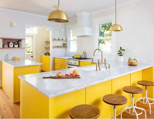 El amarillo-amarillo (no el mostaza ni sucedáneos) es el color del sol y de la luz. Por eso, emplearlo con sabiduría en la cocina da como resultado cocinas luminosas, alegres que parecen que siempre están a la espera de días soleados.