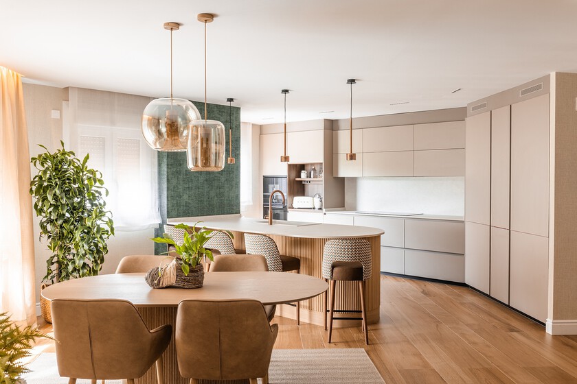 En viviendas actuales (especialmente en apartamentos urbanos) esta solución permite prescindir de un comedor independiente. La cocina se convierte en un espacio híbrido donde cocinar, desayunar, trabajar o reunirse con amigos sucede en el mismo entorno. El resultado es una estancia más viva y versátil.