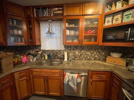 La solución del estudio pasó por reformular la planta de la cocina con el objetivo de brindar una ventana al patio trasero, y proporcionar una extensión mucho más grande de espacio de encimera y gabinetes. Y los feos armarios de madera oscura se transformaron en unos preciosos armarios en un elegante y luminoso color verde.