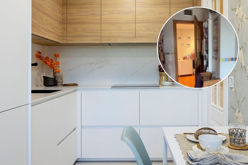 Las imágenes del “antes” muestran un espacio algo oscuro, con muebles de madera en tonos anaranjados, paredes recargadas y un pasillo funcional pero poco atractivo. A pesar de contar con los elementos imprescindibles, la cocina necesitaba más almacenaje, una mejor distribución y, sobre todo, una renovación estética que aportara claridad y calidez.