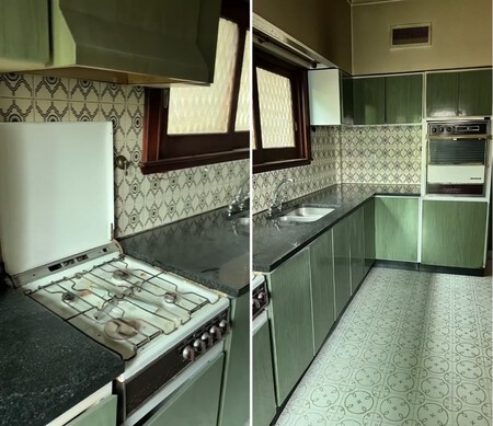 La cocina de Johanna tenía un estilo años 60 gracias al azulejo y al pavimento con motivos geométricos. Pero también tenía algo a su favor: estructura funcional intacta (encimeras, fregadero, distribución).