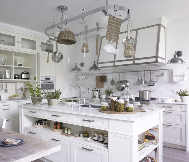 Por tradicional nos referimos a la recuperación de las piedras naturales (o los sintéticos que las imitan), a la recuperación de las molduras en las puertas y a las baldas en la cocina, que dejen a la vista los útiles y enseres más tradicionales para lucir en la cocina.