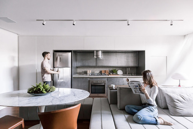 Sacar el máximo provecho a los metros de tu cocina y hacerlo con el mejor diseño posible es el objetivo de esta tendencia, que consiste en generar un marco perimetral con la parte alta y los laterales de la cocina, gracias a un cambio de material o de color en esas zonas.