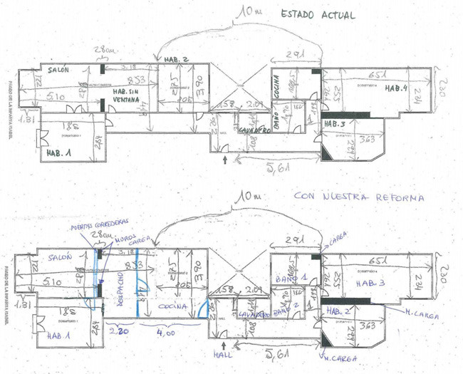 Es por eso que nuestro objetivo se centra en resolver ese problema de la cocina, intentando de paso darle unas proporciones más dignas al salón comedor, que ahora es pequeño y alargado. Esto es lo que se nos ha ocurrido.