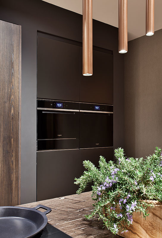 En Disak Estudio han optado por la sobriedad y elegancia del mobiliario negro en el que se integran con facilidad los electrodomésticos encastrables de Whirlpool. La iluminación se ha resuelto con un conjunto de luminarias de cobre repartidas por toda la isla que ofrece distintas intensidades de luz dependiendo de la hora, para no echar en falta la luz natural.