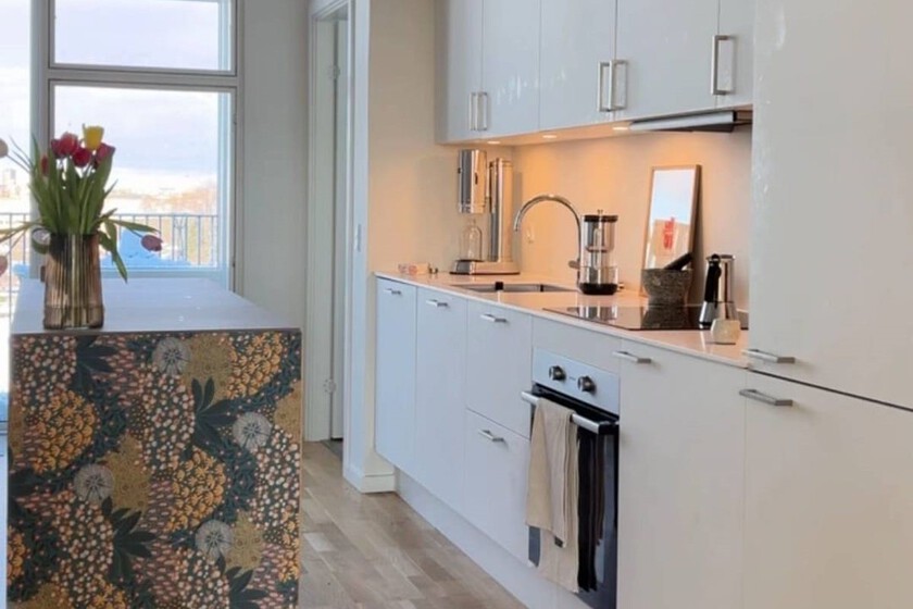 Para conseguirlo, tal y como muestra en su cuenta de TikTok @openhagenapartment, decidieron recubrir los armarios blancos con un revestimiento autoadhesivo con veta de madera, que también utilizaron para recubrir electrodomésticos como el lavavajillas o el frigorífico.