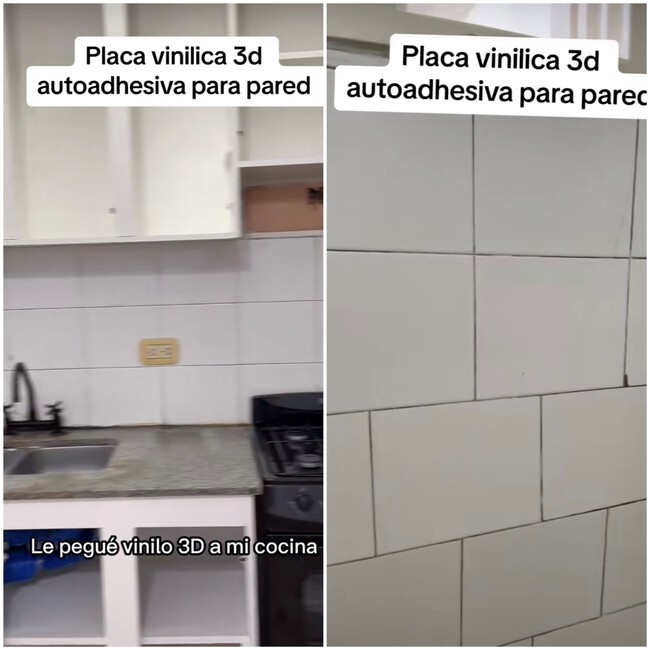 El mejor ejemplo de como, de una cocina vieja y fea, podemos sacar una mucho más actual, luminosa y cargada de vivacidad. ¡Hasta me dan ganas de cocinar! Para ello, vamos a copiar la idea de esta chica y cómo con placas vinílicas autoadhesivas 3D ha cambiado por completo la identidad de su cocina.