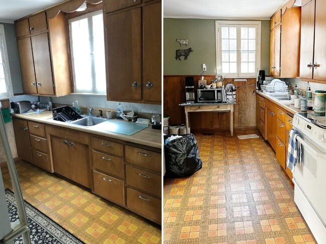 La cocina medía unos 13 metros cuadrados y llevaba décadas sin tocarse. Suelo de linóleo, armarios de madera oscura, electrodomésticos blancos de otra época... el tipo de cocina que cualquiera reconocería como "la cocina de toda la vida" en el peor sentido posible. El objetivo era modernizarla sin perder el espíritu acogedor de una casa de campo, y además conseguir que pudiera funcionar bien para los seis huéspedes que caben en la cabaña.