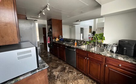 La cocina antigua era de los años 90, y en ella destacaban sus armarios en marrón oscuro y sus encimeras de granito moteado en negro y verde. El suelo de mármol oscuro tampoco hacía mucho por la imagen de esta cocina que pedía urgentemente una reforma a gritos. Esos colores hacían que la cocina pareciera mucho más pequeña y oscura de lo que realmente era.