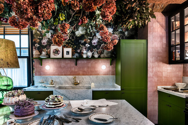 Bajo una espectacular instalación biofílica de Guguiarte realizada con materiales naturales, orgánicos y sostenibles, las interioristas organizaron la cocina con muebles de Delamora, en dos acabados diferentes: en color verde, los armarios que van adosados a las paredes, y en rosa, para la isla central. En ambos casos, se combinaron con encimera de mármol Carrara, también de Levantina. De la misma empresa, es el impresionante suelo de damero: los porcelánicos Techlam, Opium Black y Jasper White.