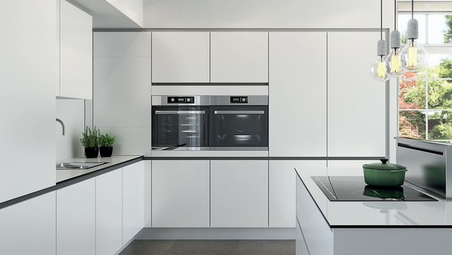 Su modelo de cocina Belina, -un modelo de cocina de muebles blancos y lisos con con tiradores integrados de barra tienen un 20% de descuento esta semana.