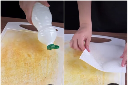 Recuperar una tabla de cortar manchada no requiere productos caros ni técnicas complicadas. Solo necesitas papel absorbente y agua oxigenada. El procedimiento es muy simple.
