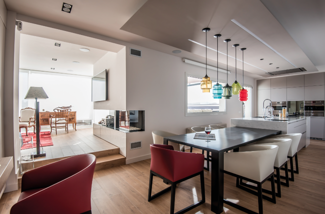 Una de las claves de este proyecto de reforma integral reside en la capacidad de Clysa, el estudio encargado del proyecto, para sacar el máximo partido a la distribución abierta de los espacios, logrando una vivienda cómoda y organizada en la que las estancias se comunican entre sí y con el exterior de manera natural. Así se favorece la libertad de movimientos y se facilitan las reuniones con amigos y familiares en la cocina, el salón comedor o en una terraza que, gracias a una pérgola retráctil, es posible disfrutar durante todo el año.