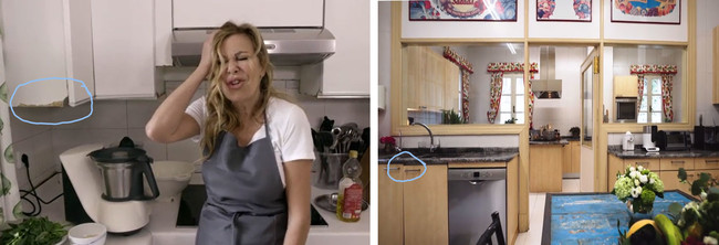 El estado de los muebles de Ana Obregón pide una reforma a gritos. El lateral de los muebles están desgastados y abiertos y los muebles sobre los fuegos están ¿quemados?; ¿en serio? El blanco de la cocina va acorde con la gama cromática de la casa pero sorprende que la encimera no tiene ningún brillo, y es que simple vista parece una encimera de melamina. Repito, ¿en serio?