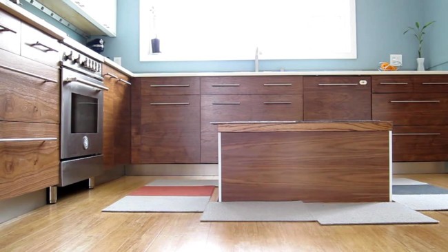 Esta es la idea que ha desarrollado Tim Thaler, y que consiste ni más ni menos que en construir una isla de quita y pon, que se esconde en el suelo accionando un mecanismo oculto. Surgen preguntas al respecto, ya que desconocemos qué hay bajo ese suelo, pero mucho nos tememos que se trata de una casa unifamiliar con un sótano en el que enterrar el invento. En un piso convencional sería imposible hacer algo igual, pensemos en nuestros sufridos vecinos del piso de abajo.