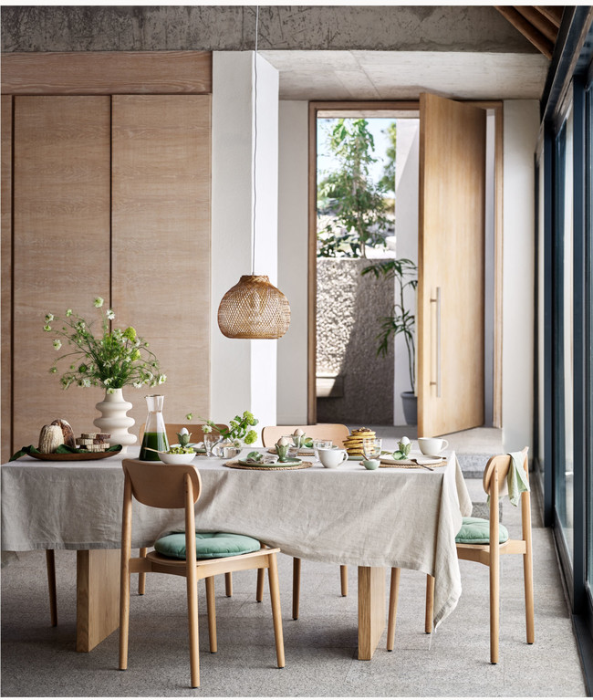 Vestir el comedor para sentarse en una mesa lo más bonita posible es un gesto que no te lleva mucho tiempo y que puede convertir cualquier comida en una celebración. Las ideas de H&M Home se centran en poner un bonito mantel, y decorar el centro con pequeños jarroones (te sirve un recipiente do tarro de cristal) con algun ramillete de plantas frescas). Sería el momento de sacar la "vajilla buena", la que reservas para ciertas ocasiones espaciales, pero ¿acaso esta no lo es?