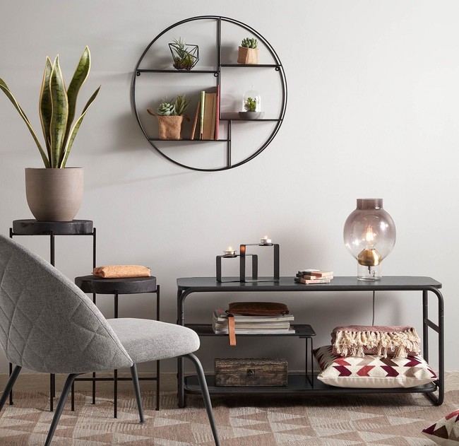 Estantería de pared redonda de madera y hierro. Precio: 49,89 €.