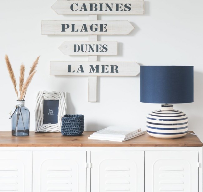 - Para iluminación, una lámpara de cerámica blanca con rayas y pantalla azul la hay por 34,99 euros.