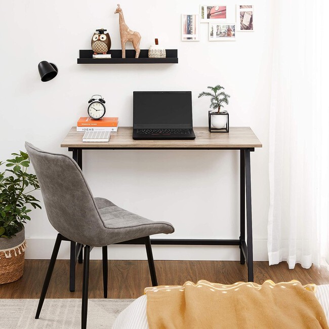 Esta mesa de trabajo de la firma Vasagle tiene unas medidas de 100 cm de largo x 75 cm de alto x 50 cm de fondo, no es difícil de encajar aunque en tu piso no dispongas de mucho espacio y sin embargo resulta cómodo para tener sobre él todo lo necesario para trabajar dejando amplio espacio para las piernas. Con un ventilador de pie al lado no te faltará de nada para teletrabajar a gusto.