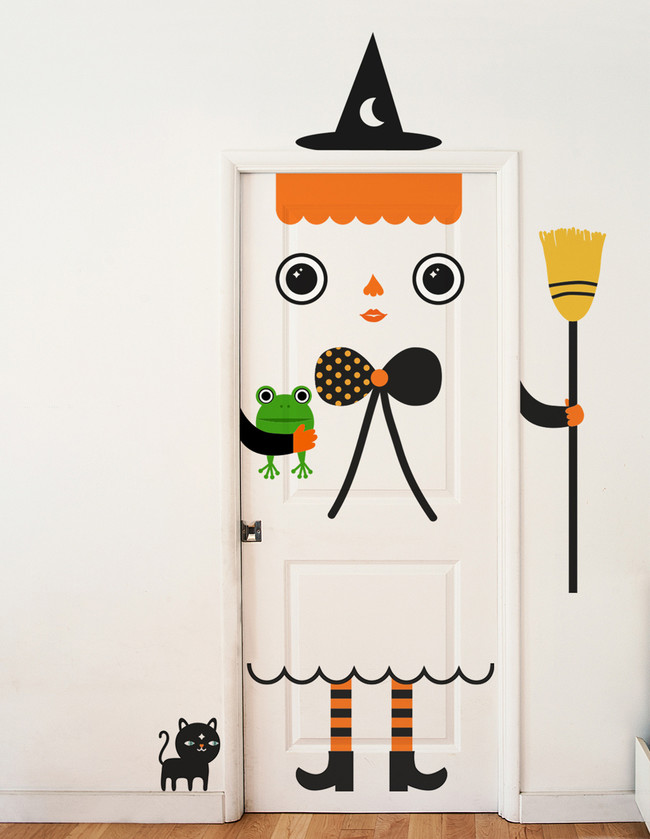 Por suerte para todos, tanto para los clientes, como para las empresas que los proporcionan y en donde se pueden adquirir, hoy en día los encontramos fácilmente. En este caso con motivos más juveniles e infantiles. Representan brujitas, piratas y conejos guitarristas. Su colocación es sencilla, las orejitas, gorros y detalles de la cabeza se colocan encima del dintel o marco de la puerta. En el interior de ésta irá superpuesto el cuerpo de la figura y por último las extremidades que según la composición se pueden adherir a la puerta o a la pared colindante, incluso algún detalle extra se puede pegar cerca de los zócalos y junto a la puerta como se muestra en estas imágenes.
