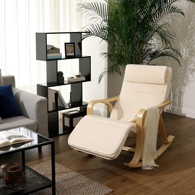 Abandonaremos sin pena los cojines para el sofá para lanzarnos encima de este mullido sillón mecedora de Songmics que más bien parece un mueble de Ikea por la limpieza de sus líneas y sus colores neutros, en un estilo nórdico fácil de combinar en toda decoración moderna.
