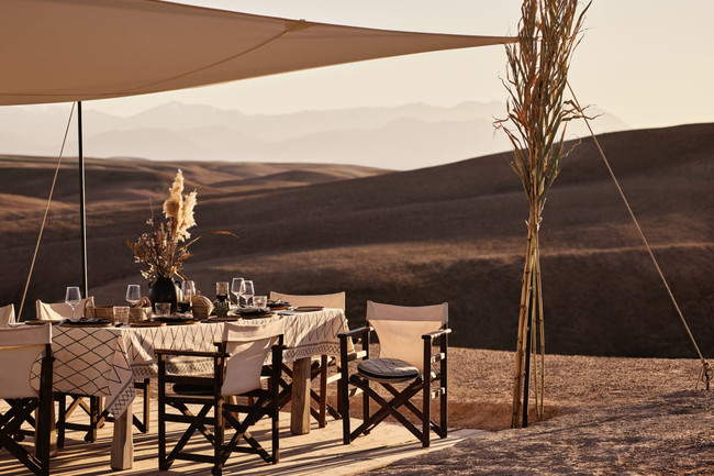 Iluminados con la luz del atardecer del desierto, sus escenarios armonizan con el entorno salvaje que participa también en los escenarios. Los materiales naturales y los tonos tostados se funden con el exterior.
