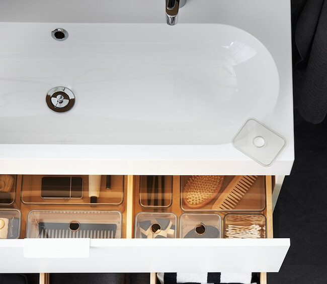 Tener bien organizados y a mano los numerosos utensilios que usamos en el baño requieren de soluciones muy específicas como estas cajas de Ikea