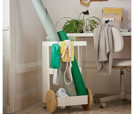 La colección Dajlien incluye todo lo necesario para disfrutar en casa de una buena sesión de gimnasio, yoga o pilates y entre sus piezas más destacadas encontramos este carrito de diseñado, a priori, para que lleves de un lado a otro la esterilla, las pesas y demás gadgets deportivos. Pero nosotros pensamos que puede tener hueco en casi cualquier estancia.