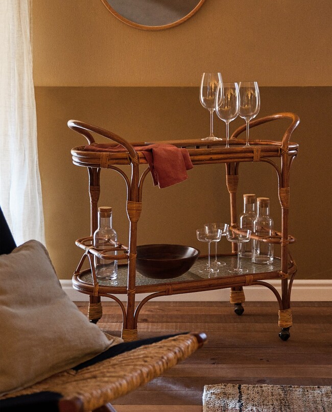 Zara Home. Camarera con estructura hecha en ratán grueso de color natural, trenzado de manera artesanal y vidrio martillado 249 €
