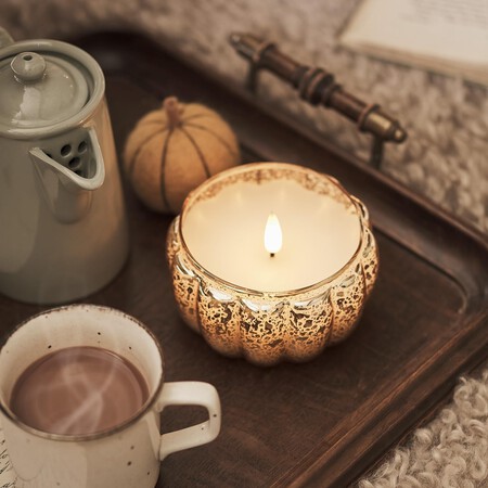 No queremos pensar mucho en el otoño todavía, pero la realidad es que ya falta poco para llegar a septiembre y si queremos tener la casa preparada para la siguiente estación al mejor precio conviene que nos adelantemos. Las decoraciones con forma de calabaza ya han empezado a llegar a las tiendas y los mejores productos siempre se agotan antes de tiempo. En la foto de portada vemos una vela LED con forma de calabaza dorada, que en realidad funciona con pilas y tiene un temporizador incorporado, su precio es de 29,99 euros, pero en Primark por mucho menos dinero podemos conseguir una vela auténtica que viene en recipiente de cerámica también con forma de calabaza.