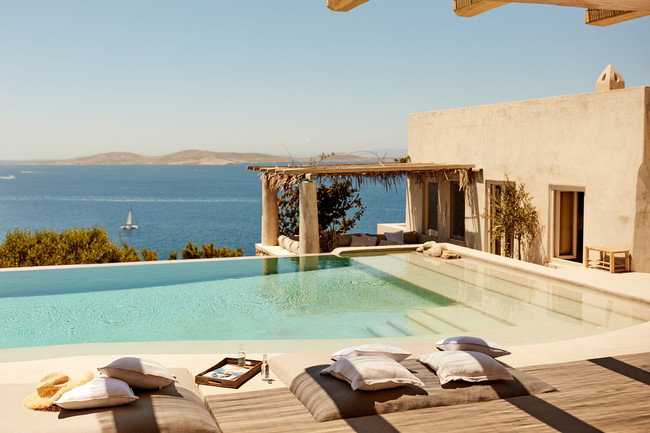 En su lugar la casa al borde del mar, cuenta con una fachada y un entorno en tonos arena, más propia de una casa de pueblo que de una casa junto al mar. Con este marco de fachada y suelos (del mismo acabado), todo se confunde y se "empasta" (esta palabra es muy Masters de la Reforma). Que no es que la casa no merezca un viaje o una estancia soñada, pero sorprende porque rompe el tópico griego.