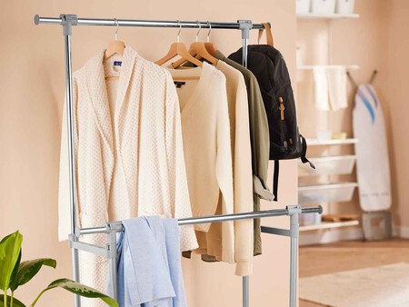 Con rudas y prácticos cierres automáticos para garantizar un extra de resistencia y seguridad, este perchero cuenta con dos barras regulables en altura para colgar todas nuestras prendas así como espacios extra para colgar la ropa en los cuatro extremos extraíbles. De regulación continua, compacto y resistente, este perchero es ideal tanto para prendas cortas como largas y su rejilla inferior garantiza un espacio extra de almacenamiento para nuestros zapatos. Un vestidor portátil por tan solo 19,99 euros en Lidl.